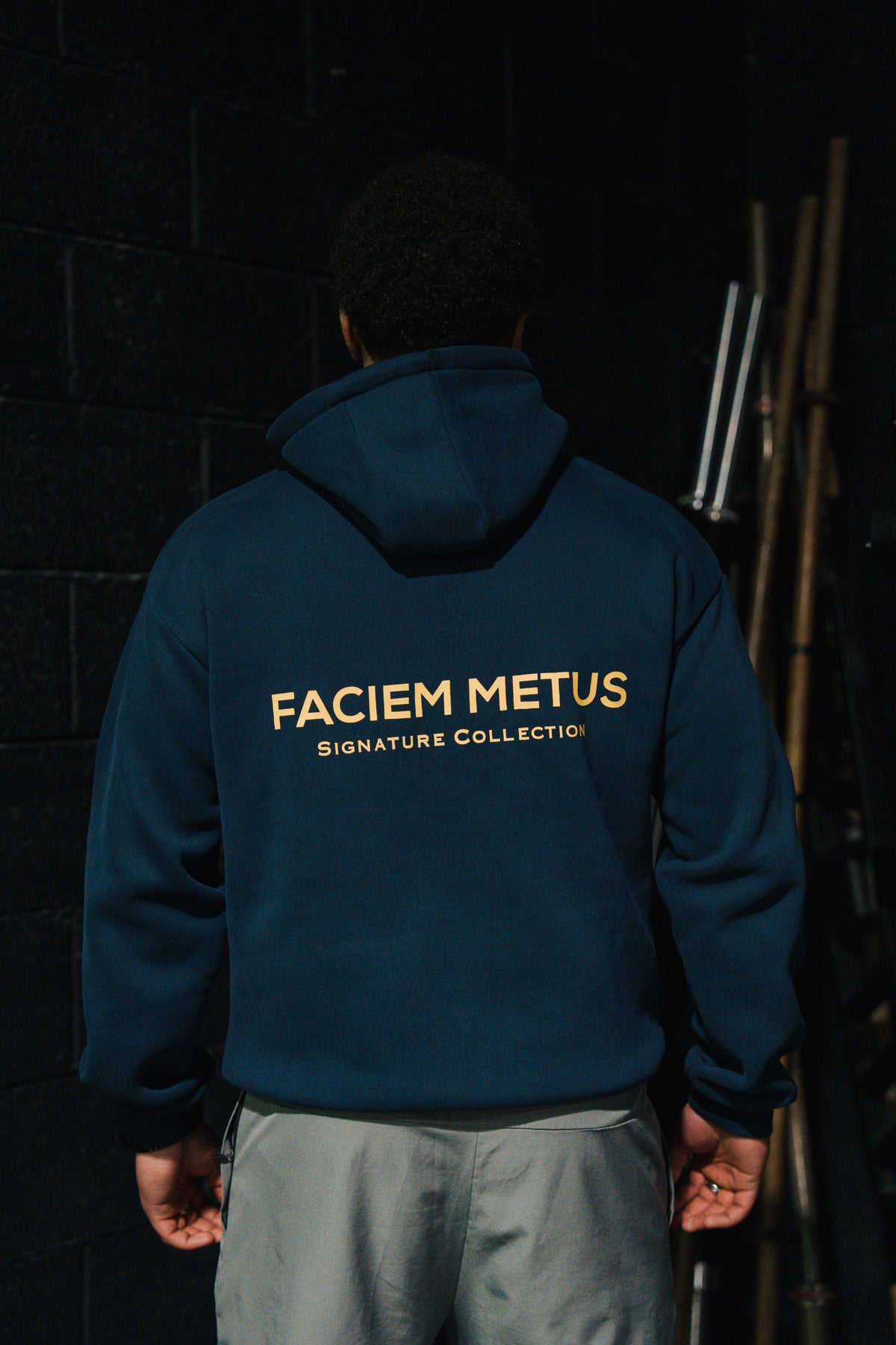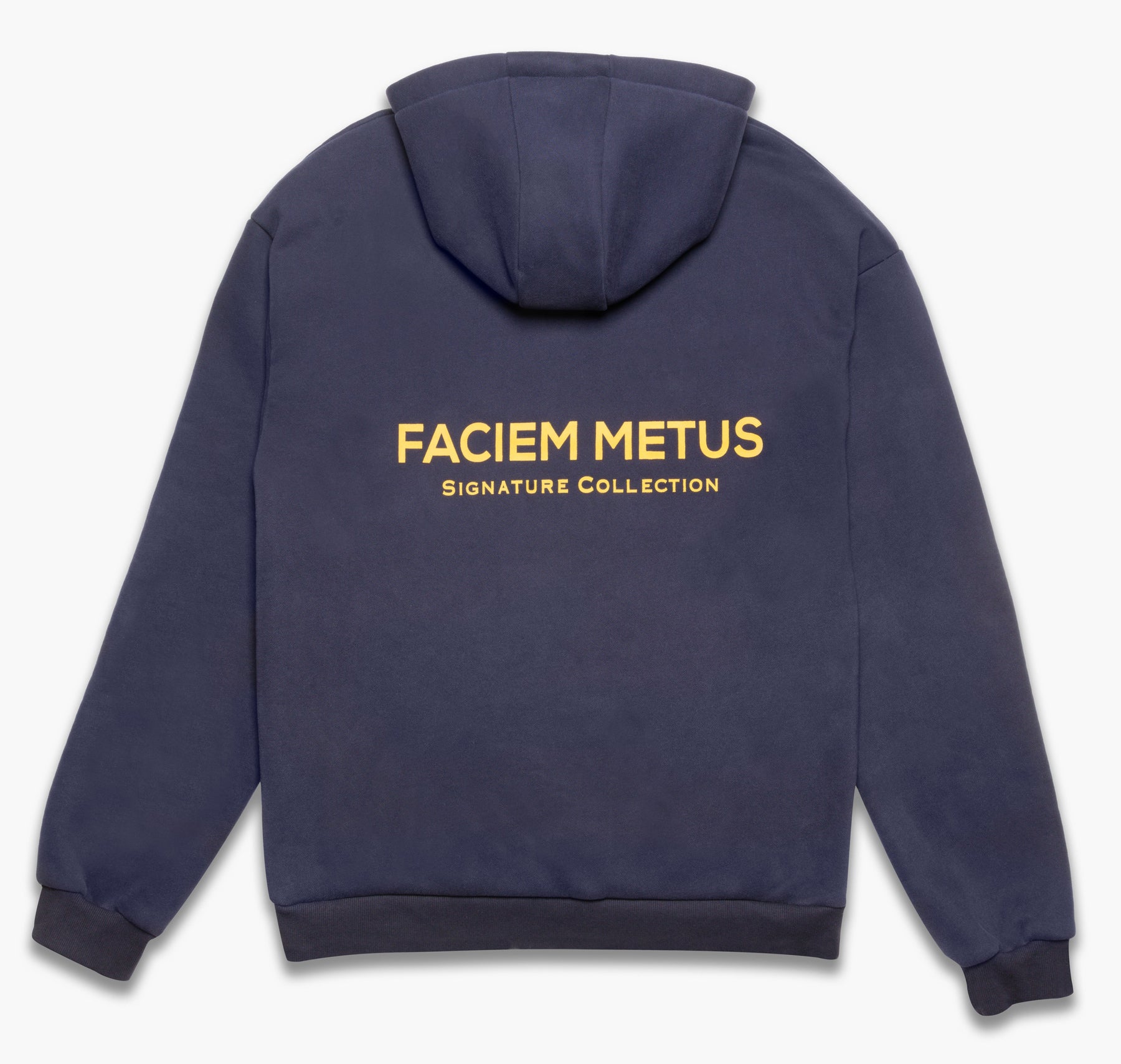 Introducing the Faciem Metus Signature Collection Hoodie. A slightly oversized navy hoodie, crafted from a heavy weight cotton. Designed with a ribbed hem and cuffs for a perfect fit, it’s completed with our Faciem Metus logo on the chest and Signature Collection print on the back.