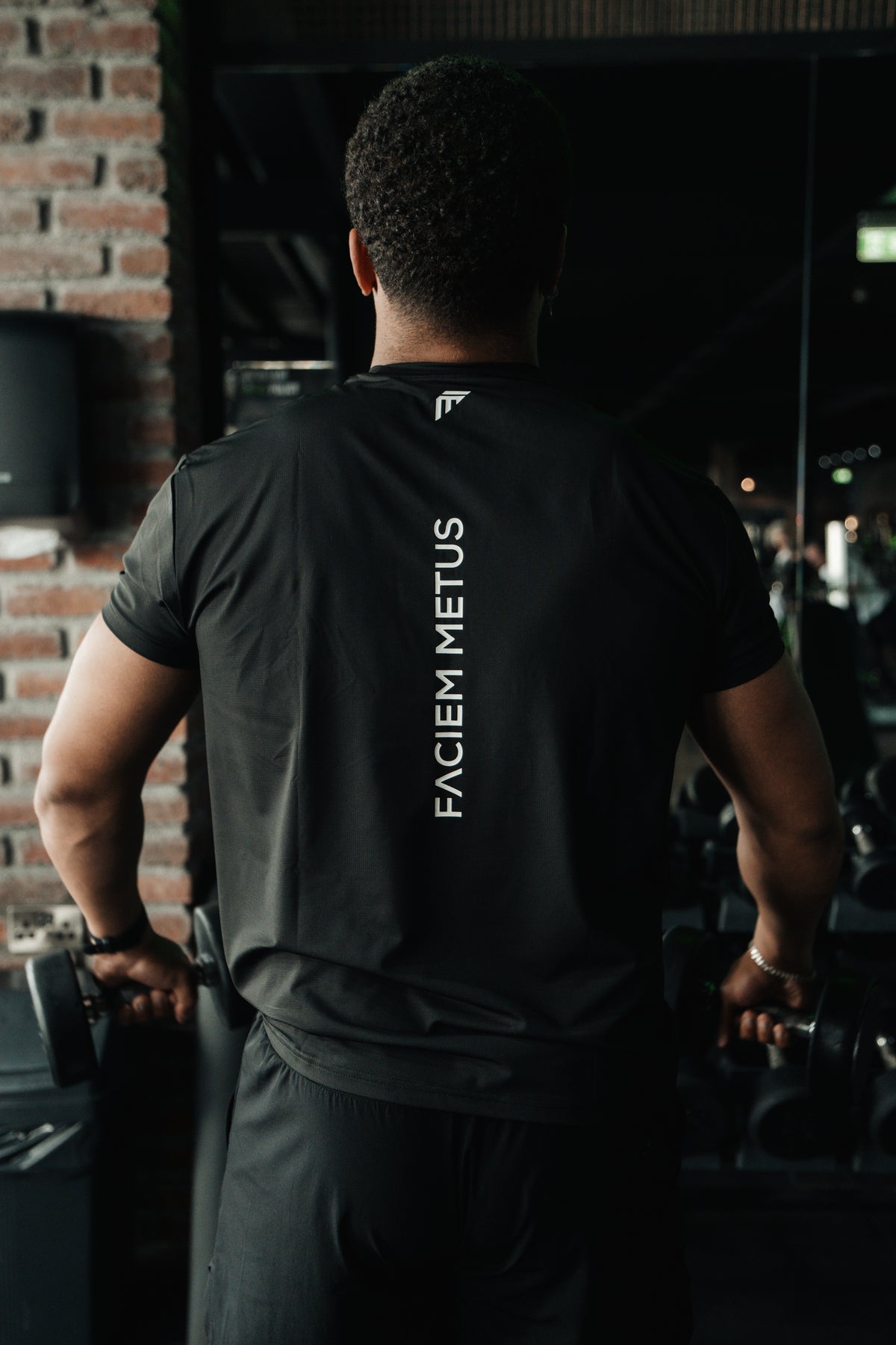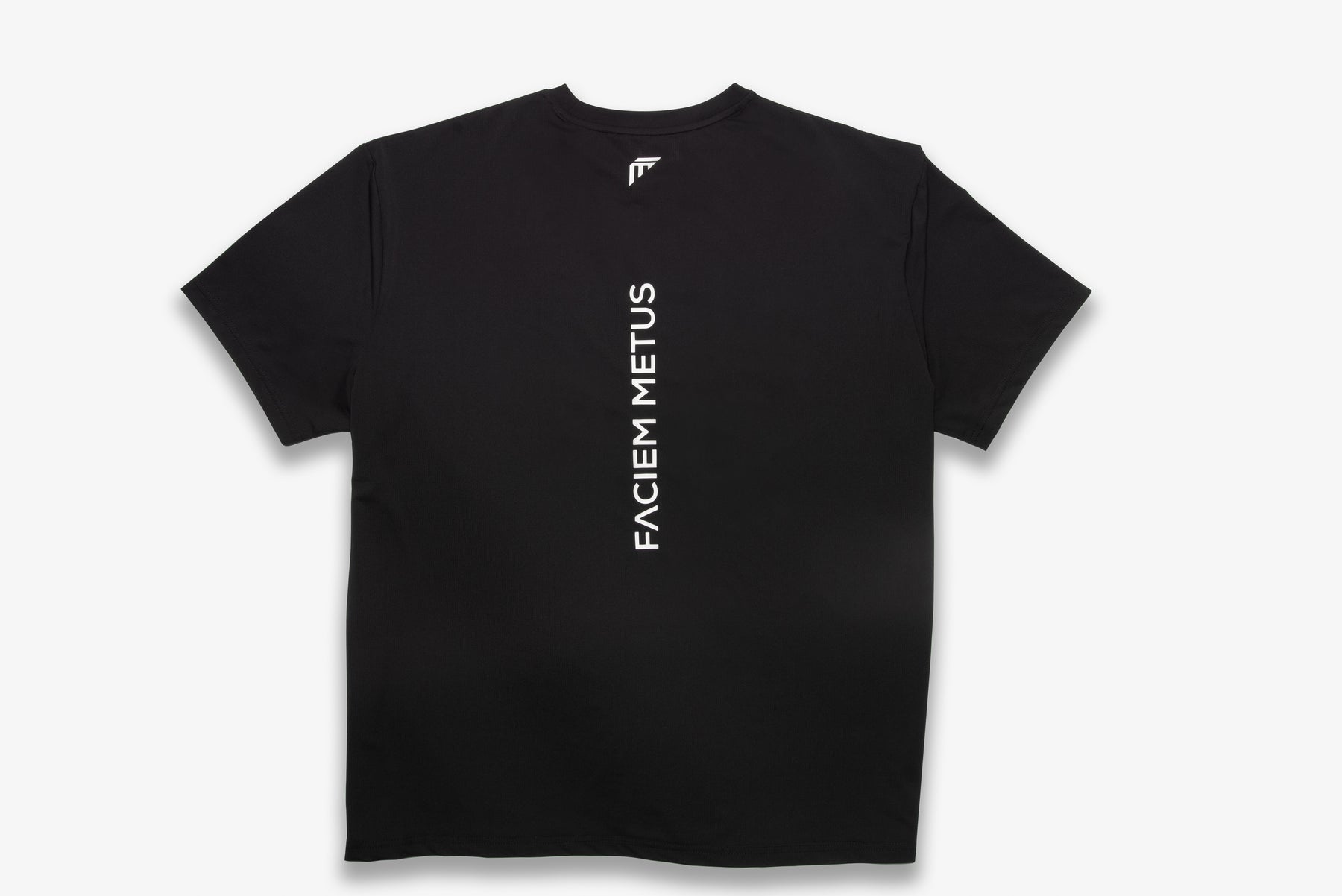 Introducing the Faciem Metus Blackout T-shirt. Constructed from lightweight, sweat-wicking fabric (88% Polyester and 12% Spandex), it delivers the perfect balance of flexibility, breathability, and durability. Designed to regulate body temperature, it keeps you cool and dry during the most demanding workouts.
