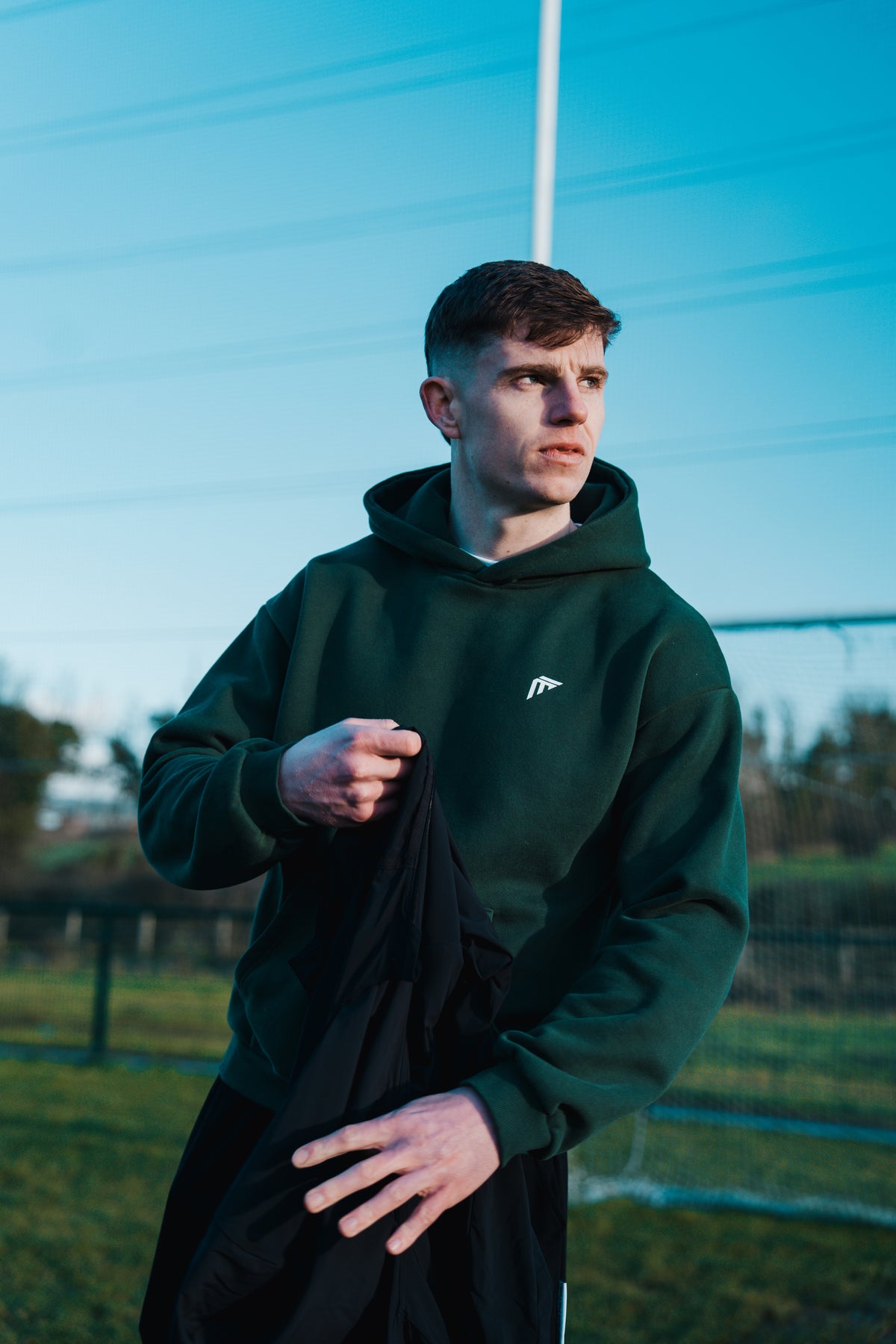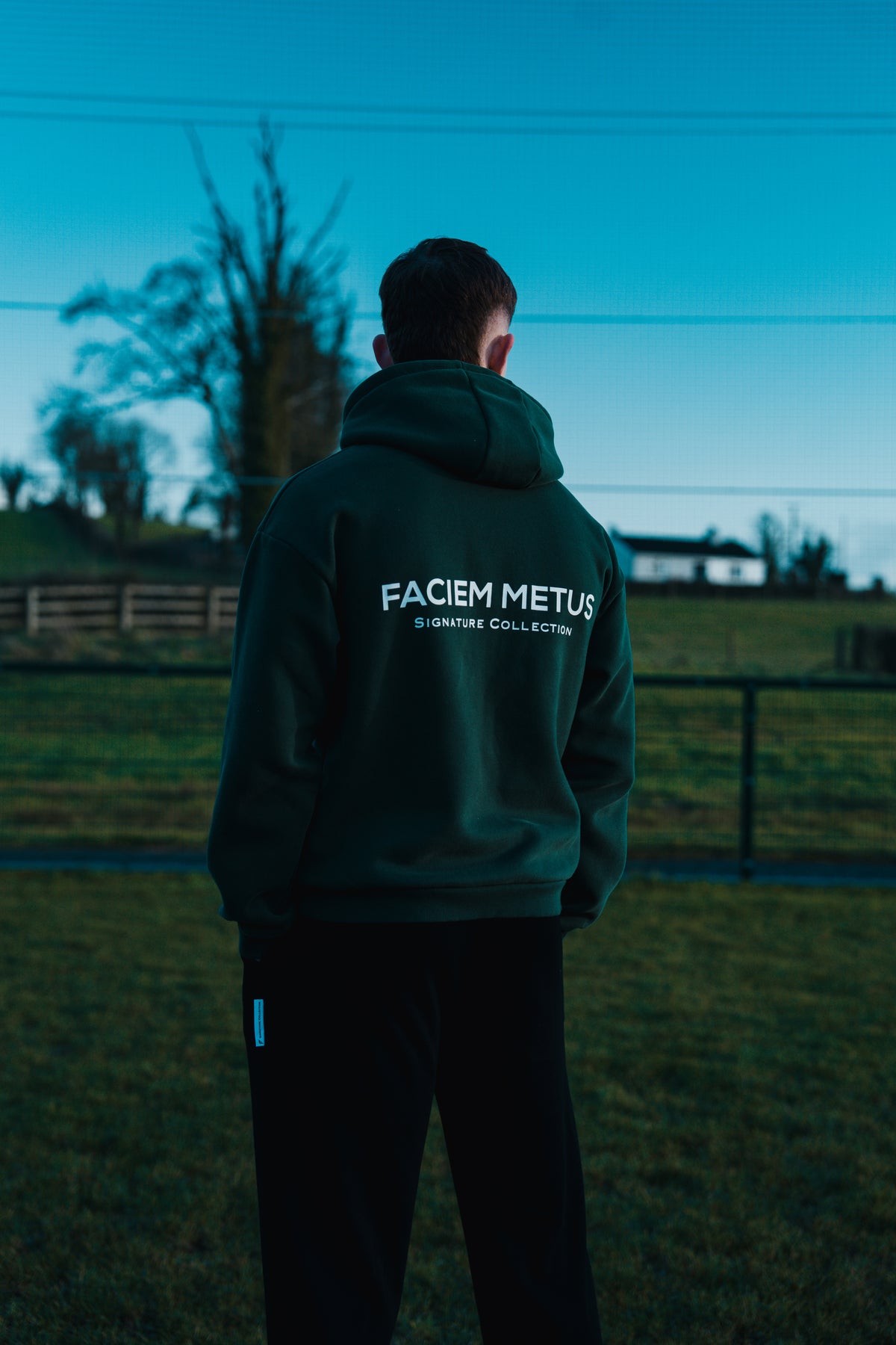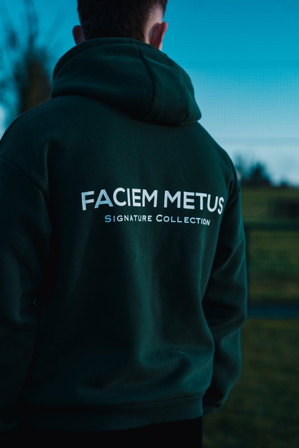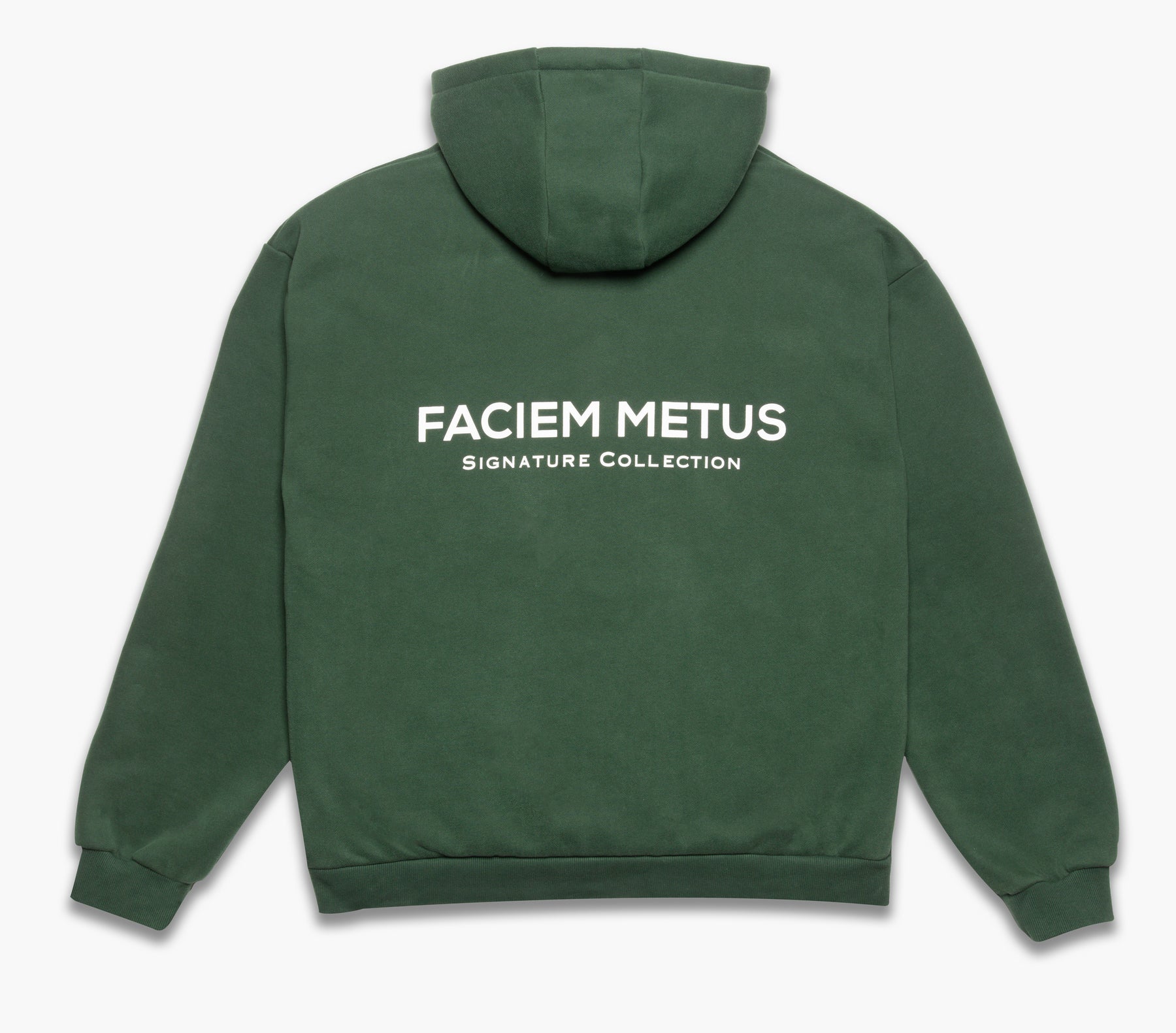 Introducing the Faciem Metus Signature Collection Hoodie. A slightly oversized racing green hoodie, crafted from a heavy weight cotton. Designed with a ribbed hem and cuffs for a perfect fit, it’s completed with our Faciem Metus logo on the chest and Signature Collection print on the back.