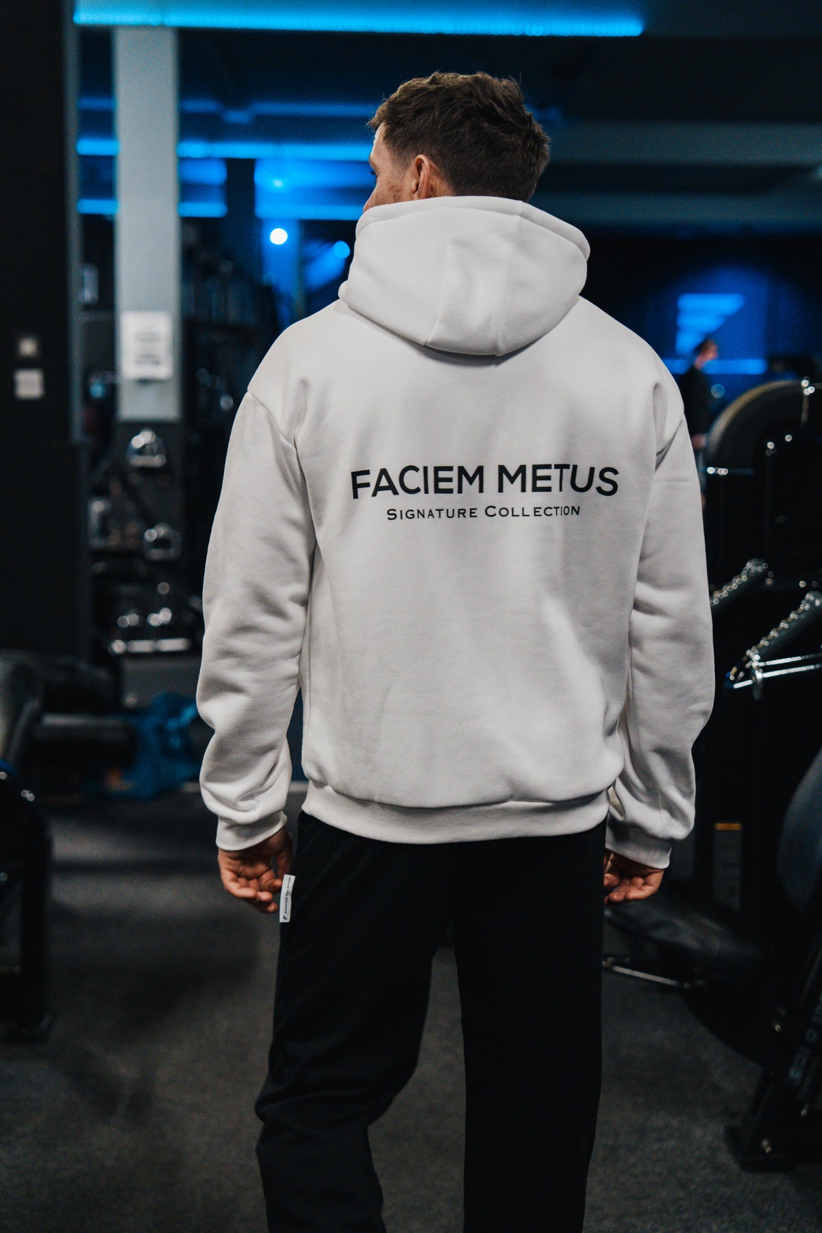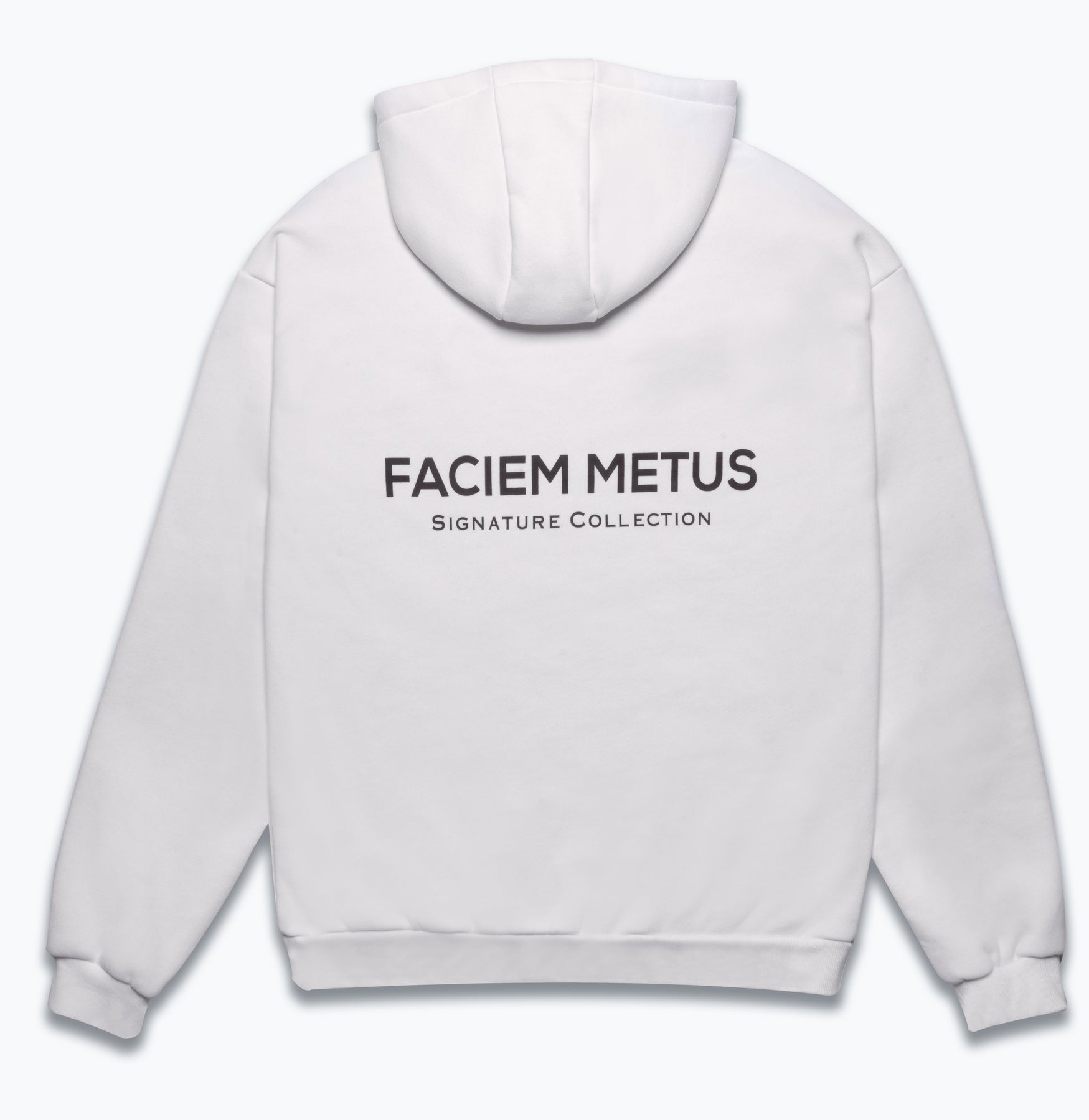 Introducing the Faciem Metus Signature Collection Hoodie. A slightly oversized white hoodie, crafted from a heavy weight cotton. Designed with a ribbed hem and cuffs for a perfect fit, it’s completed with our Faciem Metus logo on the chest and Signature Collection print on the back.